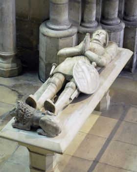 Malheureusement, on pourrait une fois de plus critiquer les restaurations que son état nécessita : nez, mains et dague furent refaits, le lion à ses pieds n’est probablement pas celui d’origine, les armoiries sur l’écu ont subi quelques fantaisies.