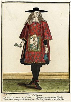 carton » sur la poitrine et, dans des temps plus anciens, ils devaient porter des armes également sur le dos à la façon d’un scapulaire. Dans quelques villes de province, ils portaient une casaque noire. Interdiction leur était faire d’innover en coutume ou en tenue.