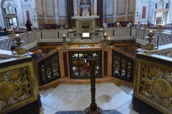► Le second, effectué en 2006 sous l’autel principal de la basilique, à l’intérieur de la Confession, a permis d’accéder au sarcophage, au niveau du sol de la basilique construite par l’empereur Théodose à la fin du 4ème siècle : la plaque de marbre, toujours visibles sous le maître-autel furent retrouvées.